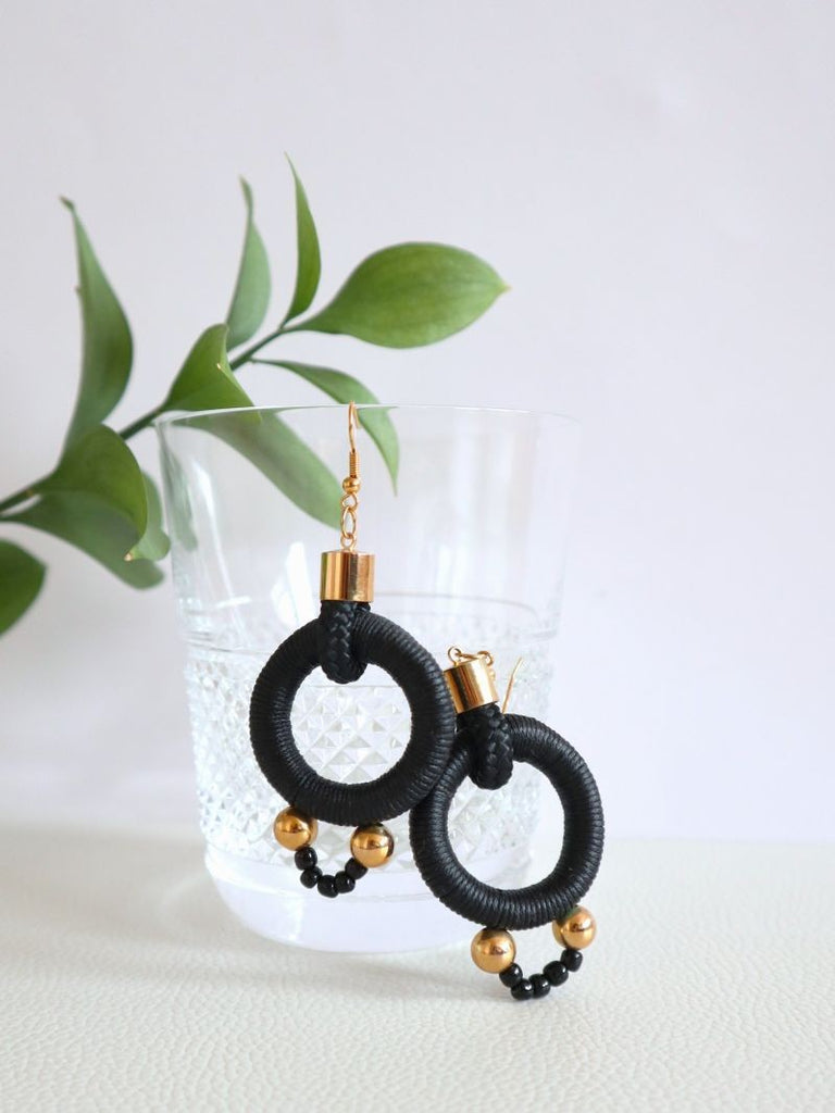 Shaped rope earrings, wrapped in wax cotton thread with glass beads and gold plated beads and finished with gold plated earring caps and nickel-free hooks.